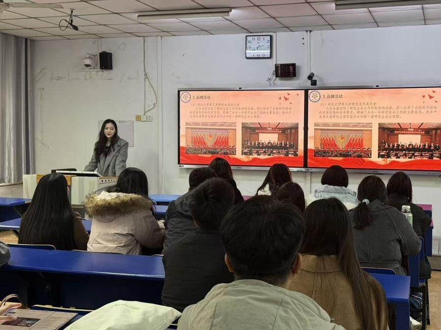 紧接着河北大学研究生会组织管理中心部长王一丹用清晰直观的分享,解锁各组织的核心职能与特色亮点。校研究生会作为统筹校园研究生工作的核心枢纽,从研代会筹备、思政教育开展到文体活动策划、就业信息整合,覆盖研究生成长全周期;研究生发展中心则聚焦学术、志愿、文化三大领域,四大分支各展所长,既让研究生课余生活愈发充实,更实现了成长价值的多维提升;“求是”研究生宣讲团以思想引领为核心,通过“大思政小讲堂”等活动,让党的创新理论与文化内涵直抵青年心田,此次更是带来保密主题专项宣讲,彰显责任担当。三大组织既明确了分工定位,更凸显了协同发力的工作理念,为校院两级研究生组织后续联动搭建了更为清晰的沟通桥梁。