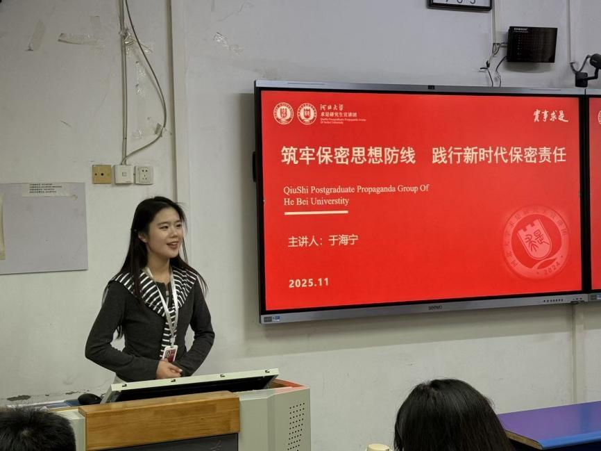 第二环节,“求是”研究生宣讲团讲师于海宁以《筑牢保密思想防线,践行新时代保密责任》为题展开精彩宣讲。此次宣讲响应国家号召,精准对接高校校园安全需求,结合研究生成长发展特点,通过典型案例分析、保密规范解读等生动形式,系统传递保密工作重要意义、潜在风险隐患及实用防范要点。宣讲紧扣日常学习、网络使用等高频场景,明确行为规范,引导师生牢固树立“保密有责、防微杜渐”的意识。整场宣讲内容简洁务实,重点突出,师生专注聆听,深刻认识到保密与个人、校园及国家利益的紧密关联,表示将自觉严守保密底线,共建“学保密、懂保密”的校园氛围。