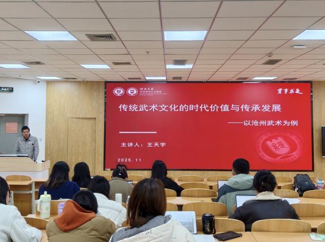 此外,“求是” 研究生宣讲团王天宇同学作为校研会特色宣讲力量的代表,为在场校院研会成员带来“沧州武术文化的时代价值与传承” 主题分享。他从沧州武术历史渊源切入,结合霍元甲等武术名家的励志事迹,深入剖析其中蕴含的“身心一元” 智慧与 “自强不息” 精神,并针对传承挑战提出发展路径。宣讲中,他通过“八极拳摘杏” 等生动案例,既展现中华优秀传统文化的魅力,更启发校院研会成员探索跨界融合新形式,为后续开展特色活动提供了新颖思路和创作灵感,助力校研会丰富服务载体、拓宽思想引领维度。