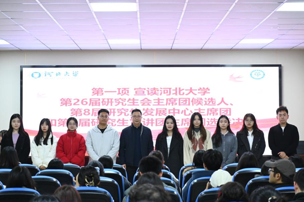 首先,由刘冲老师宣读河北大学第26届研究生会主席团候选人、第8届研究生发展中心主席团和第2届“求是”研究生宣讲团主席团选举决定,并与主席团成员合影留念。