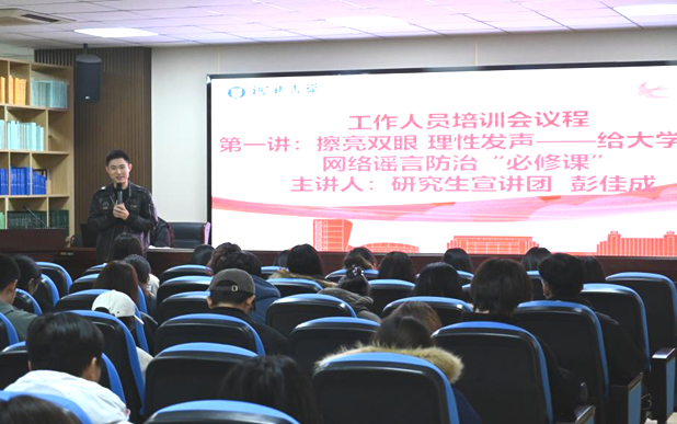 培训阶段,首先由研究生求是宣讲团彭佳成同学以《擦亮双眼 理性发声——给大学生的网络谣言防治“必修课”》为题展开宣讲。他结合典型案例解读网络谣言相关法律知识,提出识别谣言的方法,帮助同学们增强网络谣言识别意识,树立理性发声观念。